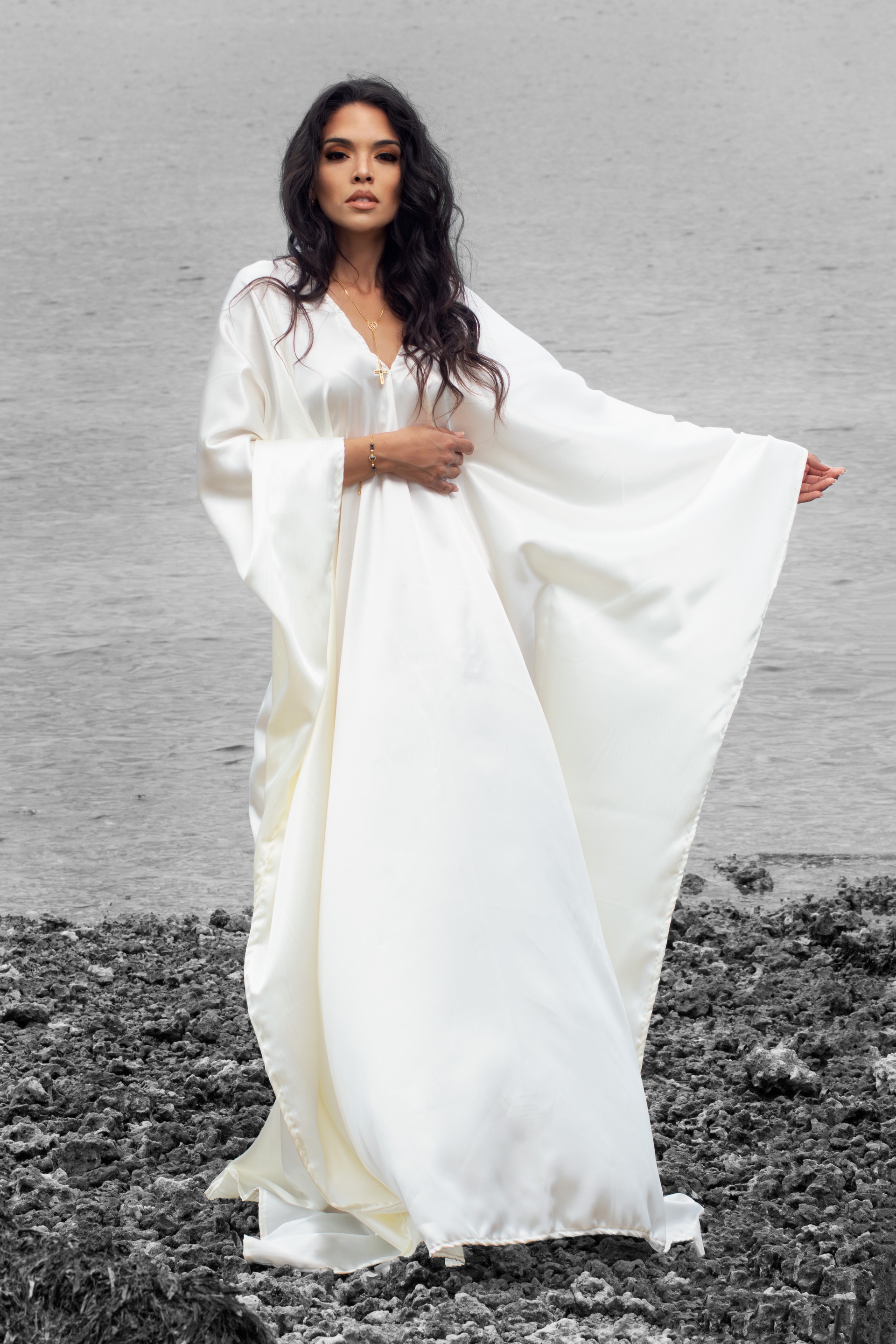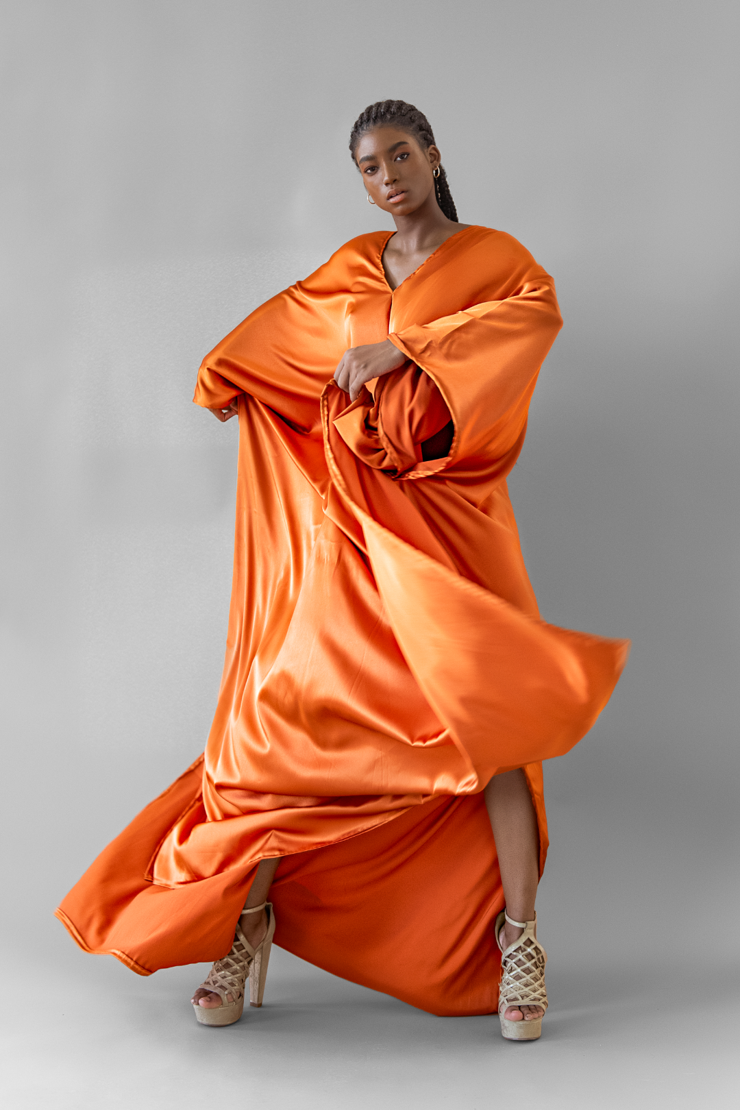 A captivating full-length kaftan meticulously handcrafted with satin and Ankara, celebrating the convergence of elegance and vibrant grace in the I AM EIDO style.